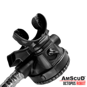 Dependable downstream demand valve design simplicity of design is perfect for rental applications. The regulator has a large diaphragm for quick inhalation response and large exhaust valve that decreases exhalation effort. Adjustable dive/pre-dive switch prevents free flow when entering the water or surface swimming through surf zones. The AmScuD Robot Octopus comes with a 36″ (91.44cm) 3/8″ threaded LP rubber hose.
